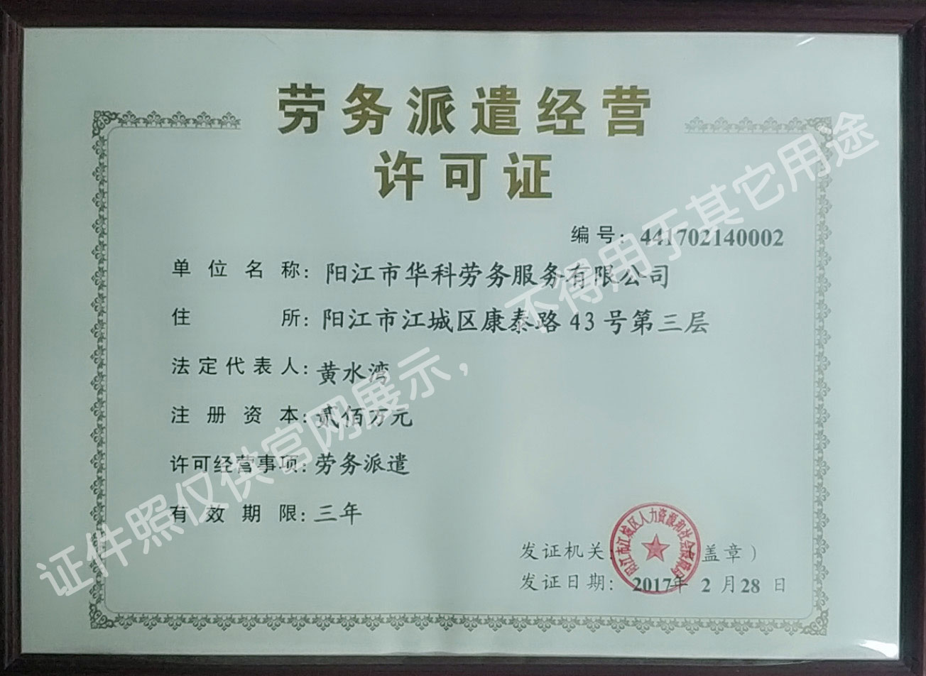 華科勞務(wù)服務(wù)有限公司是專業(yè)從事人事代理、勞務(wù)租賃、人力派遣及管理的綜合性服務(wù)機(jī)構(gòu),是首批獲得廣東省人力資源廳、陽江市勞動和社會保障局頒發(fā)人力資源許可證的合法單位。公司秉承“誠信務(wù)實、專業(yè)熱情、滿意第一、服務(wù)社群”的經(jīng)營理念,在勞務(wù)派遣業(yè)務(wù)的基礎(chǔ)上,更致力于合同制工人(臨時工、實習(xí)生、假期工)方向發(fā)展,為用工企業(yè)及時輸送合格的各類人才,合理調(diào)配人力資源的有序流動,幫助求職者尋求更加滿意的就業(yè)渠道和崗位,切實維護(hù)求職者的合法權(quán)益。